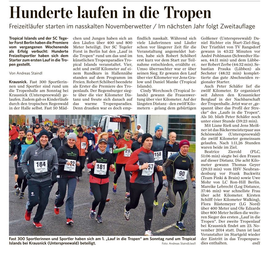 Bei leichtem Nieselregen und gerade mal 4°C startete am Sonntag zum ersten Mal der Lauf in die Tropen. 4, 8 oder 12 km mussten absolviert werden um danach in das 30°C warme Wasser im Tropical Island springen zu können.